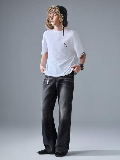 Men's Streetwear Loose Fit Embroidered Color Block Long Denim Jeans-65%