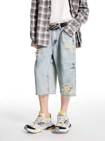 Men's Light Blue Vintage Washed Denim Distressed Loose Fit JORTS Shorts-60%