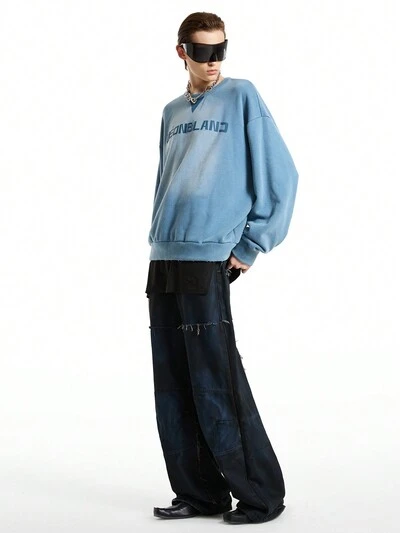 Men's Street Style Letter Print Distressed Crew Neck Long Sleeve Pullover Sweatshirt, For Fall Winter-25%