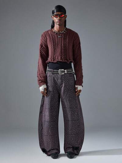 Men's Casual Loose Fit Rhinestone Embellished Long Denim Jeans-60%
