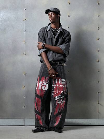 Men's Cotton Distressed Loose Straight-Leg Spray-Painted Jeans-60%