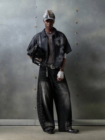Men's Street Fashion Curved Jeans, Long Length Relaxed Fit Unique Denim Pants-65%