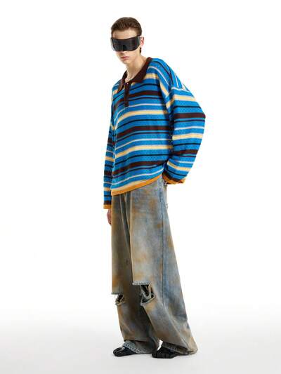 Men's Blue Stripe Colorful Urban Crew Neck Long Sleeve Sweater, For Fall Winter-26%