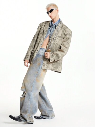 Men's Street-Style Tie-Dye Boxy Padded Shoulder Loose Fit Woven Blazer Jacket Suitable For Fall & Winter Fashion
