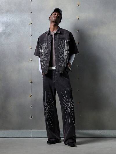 Men Gothic Street Style Loose Fit Salt Wash Rhinestone Accent Wide Leg Jeans, Streetwear Edition-71%