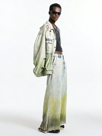Men's Vintage Gradient Green Loose Denim Long Sleeve Jacket, Streetwear Style-60%